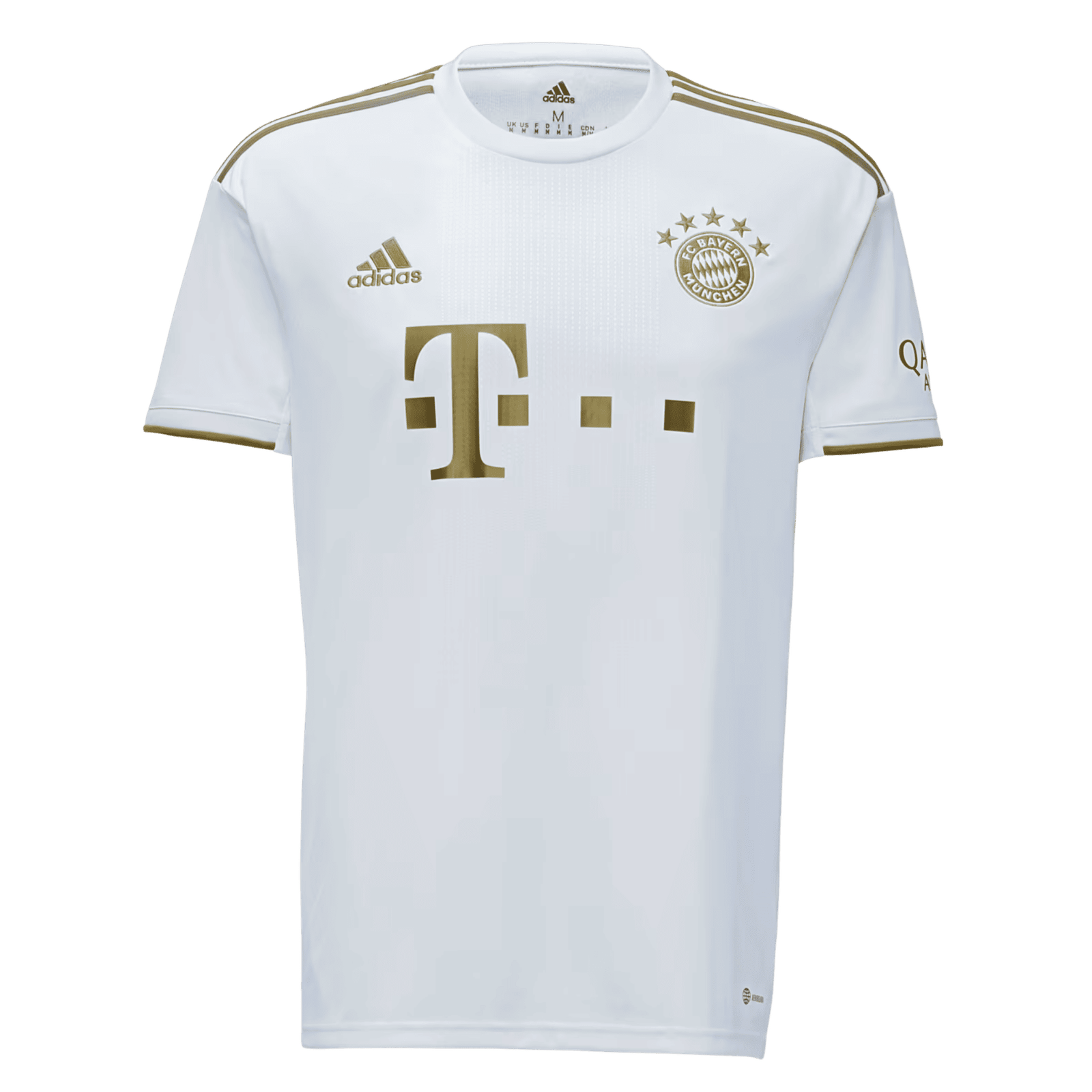 The 22/23 Bayern Munich Away Jersey features a bright white base accented by metallic gold detailing—creating a sleek, luxurious aesthetic. A subtle geometric pattern sits across the front panel, adding depth to the minimalist design. Built with lightweight, breathable fabric, this jersey ensures comfort whether worn on matchdays or as part of a casual streetwear look.
